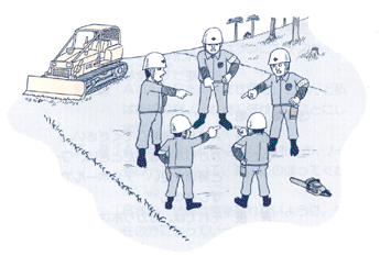 危険予知のしかたにはいろいろな方法がありますが、「林材業ゼロ災運動」では、毎朝、作業現場において、危険を危険と気付くための話し合い「危険予知ミーティング」を行って、その日の作業における危険な事項を確認し合い、注意しようというもの です。