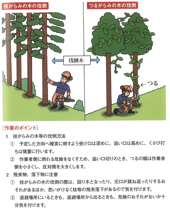 - 伐倒前に上方確認を必ず行い伐倒木と隣接木の幹と枝が絡んでいるのに対応した作業方法を選ぶこと。