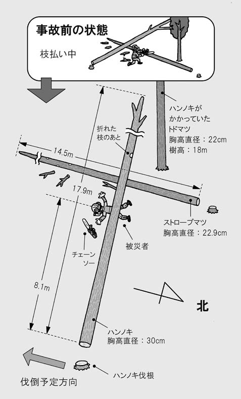 チェーンソーは被災者の頭部付近にあったが、エンジンは止まっていた。 - ハンノキと交差する状態で、伐倒されていたストローブマツの枝払いが、交差箇所まで終わっていた。