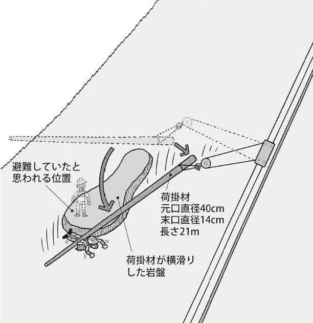 荷掛材の元口が吊り上がり始めた時に、末口側が露出していた岩盤上を滑り始め、被災者は横滑りした荷掛材に激突して死亡した。